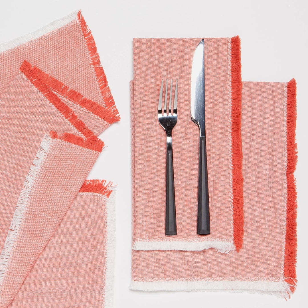 Chambray weaves color with white, resulting in muted, soft variations of favorite shades. Raw edges spotlight the technique in two-color fringes that bring a textural sophistication to your meal.